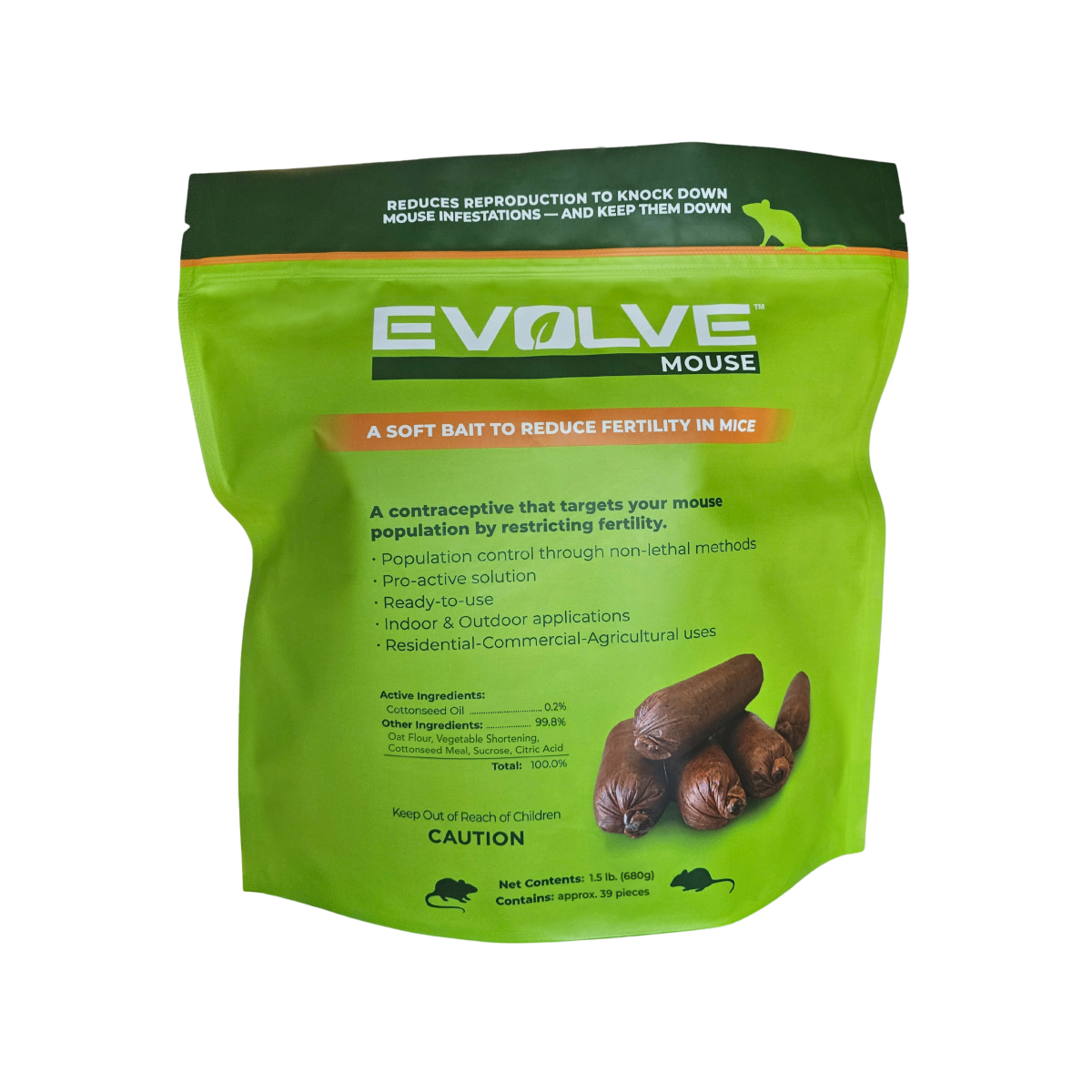 Evolve® Mouse is the ultimate solution for effective mouse population control. Our Mouse Birth Control™ is a scientifically advanced soft bait (sausages) that attracts mice with its palatable ingredients, in fact they love it! Ideal for indoor and outdoor use, Mouse Birth Control provides a reliable and safe method to reduce infestations, without harming the mice or people or pets.